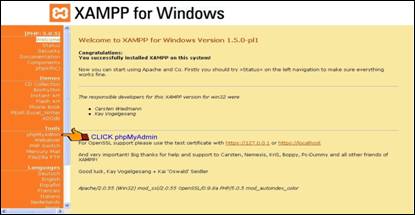 Your database will be created using a special application provided with Apache-MySQL-PHP (XAMPP) installation. This application is named phpMyAdmin and it is a PHP scripts package. PhpMyAdmin helps you to manage databases. It allows you to create and access databases and to create, modify, add and delete tables and fields in your databases. It will also allow you to backup and restore databases, plus perform simple and complex queries. PhpMyAdmin is the most web-based popular interface for MySQL database administration. It looks like a web site and you can to access it from the URL http://localhost/xampp/, (see fig. 1.1.)